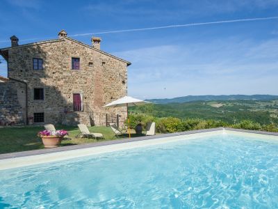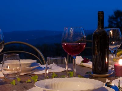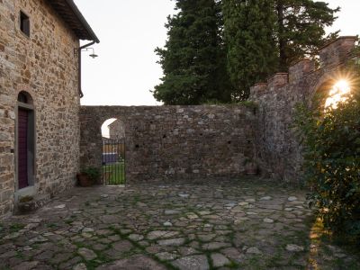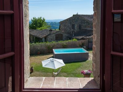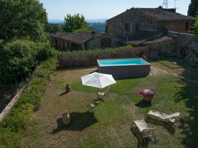 The garden, separated from the village by a high medieval wall, opens on the hills of Greve in Chianti, Panzano, Castellina and Radda in a wide, spectacular view. A corner with a dining table, deck chairs on the meadow and a pool allow you to live unforgettable moments in the open air: breath the clear Chianti air around you!