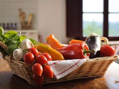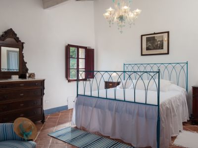 The first floor also has beamed ceilings, whitewashed like in old times when lime was used to disinfect: it was a separate apartment for a family of farmers. We have created two very large bedrooms with en suite bathroom, each furnished with our antique wardrobes and chests of drawers. The one overlooking the garden is large enough for our old 'emperor size' wrought iron bed; in the other one we placed a carved wooden bed with baldachin. The last small, cosy room has two wrought iron twin beds. If you want to watch TV, read or rest indoor, the sitting room, with a comfortable sofa and armchairs, will be the ideal place.